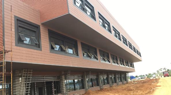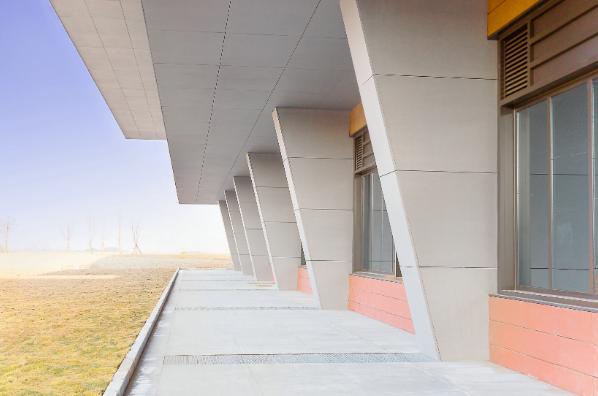 項目介紹:該項目吊頂及一層梁柱均采用了清水混凝土掛板作為外墻裝飾,淺灰色與與磚紅色搭配,使整個建筑更加有氣勢。