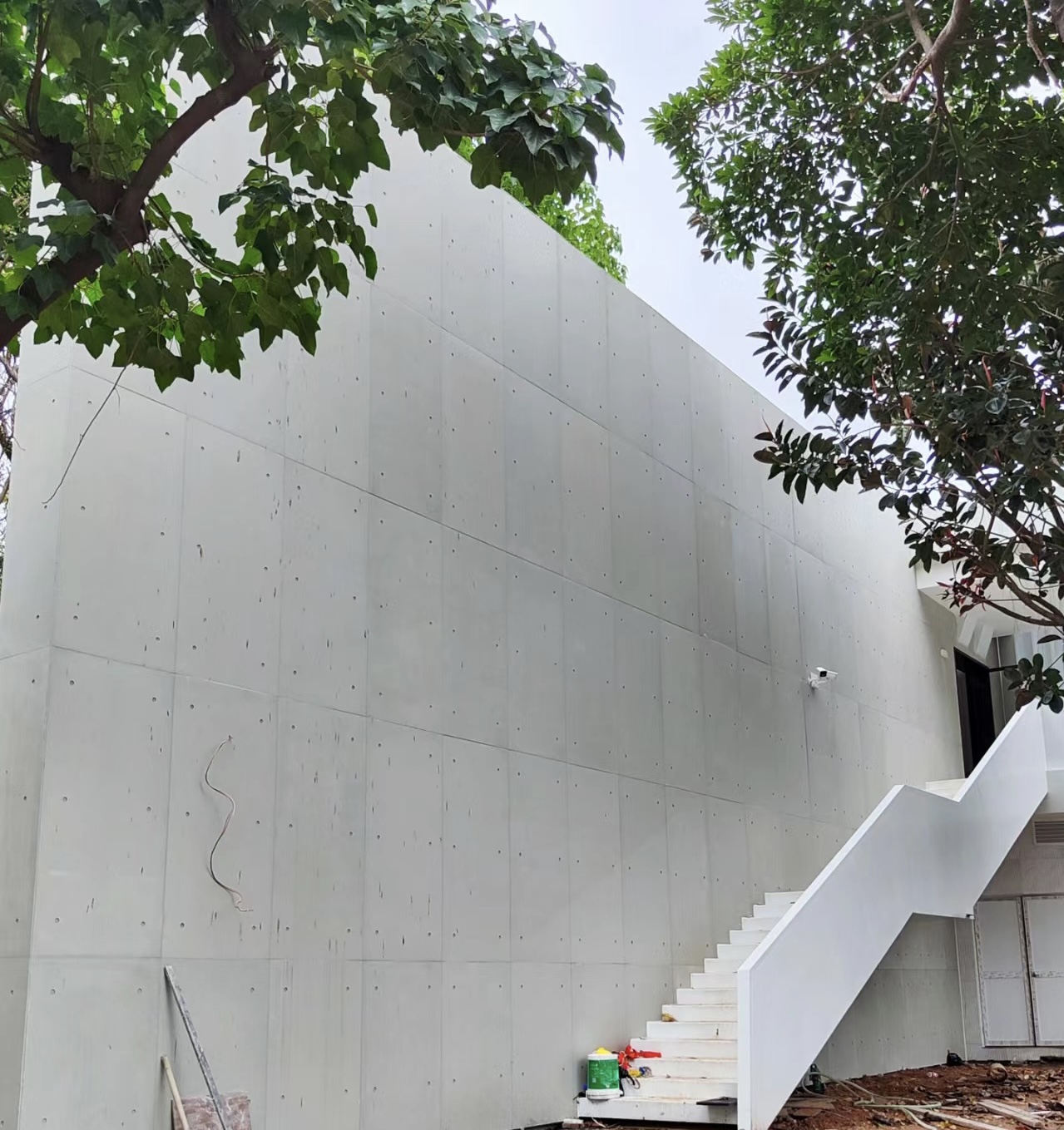 清水混凝土掛板是采用玻璃纖維增強(qiáng)混凝土等基材,制作出清水混凝土的飾面效果,所呈現(xiàn)的就是清水混凝土的肌膚裝飾肌理。這種清水混凝土掛板可實(shí)現(xiàn)工業(yè)化、批量化生產(chǎn),工廠機(jī)械加工,可制作各種造型、顏色以及多種飾面效果。